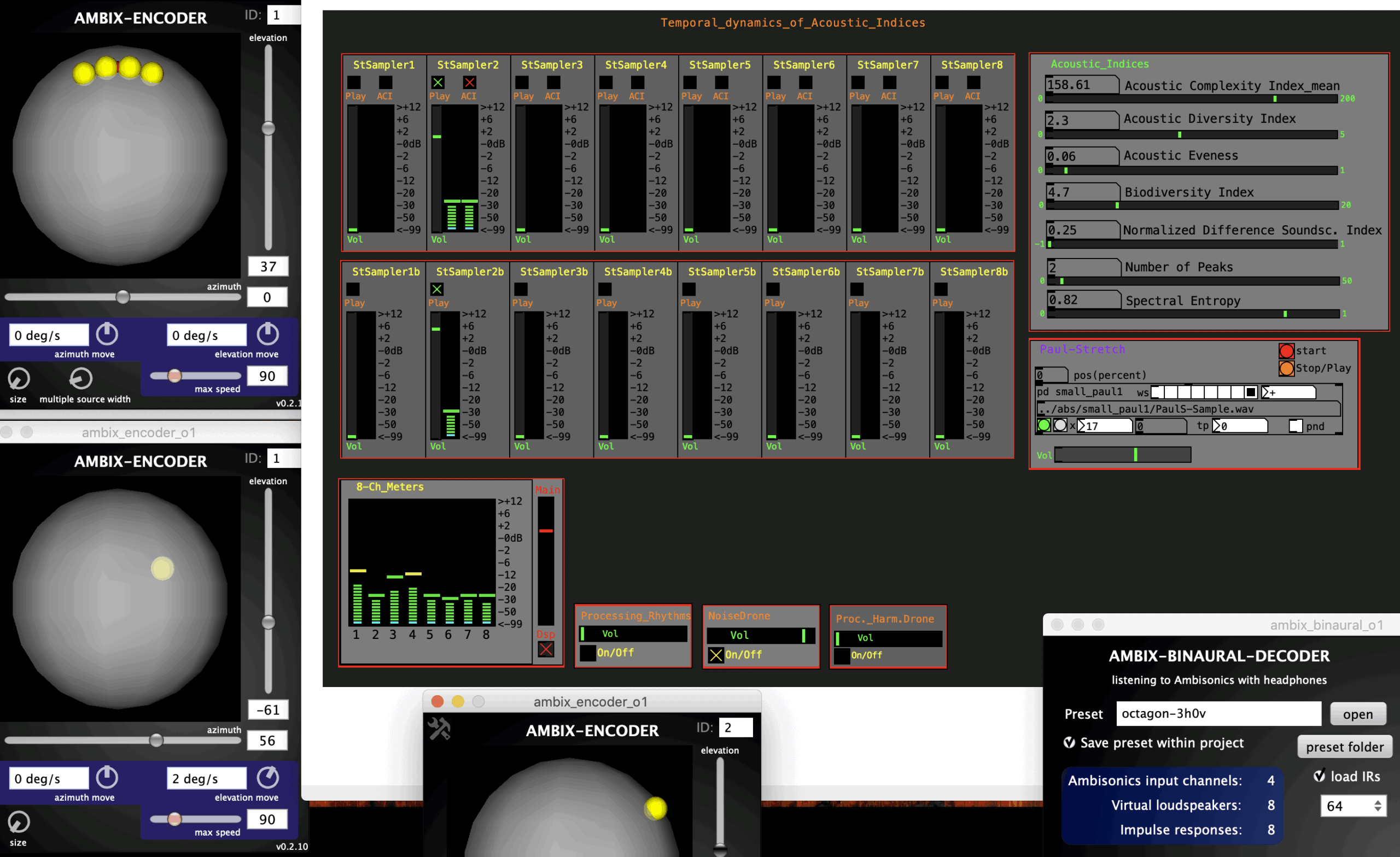is a set of three synthesizers for the sonification of acoustic indices. In this patch, the Acoustic Complexity, Acoustic Diversity, Acoustic Evenness Index, Bioacoustic Index, Normalised-Difference Soundscape Inndex, Number of Peaks and Spectral Entropy are calculated for three different location recordings. This patch was developed to make the acoustic indices audible. This is the basic construction for Etude IV.